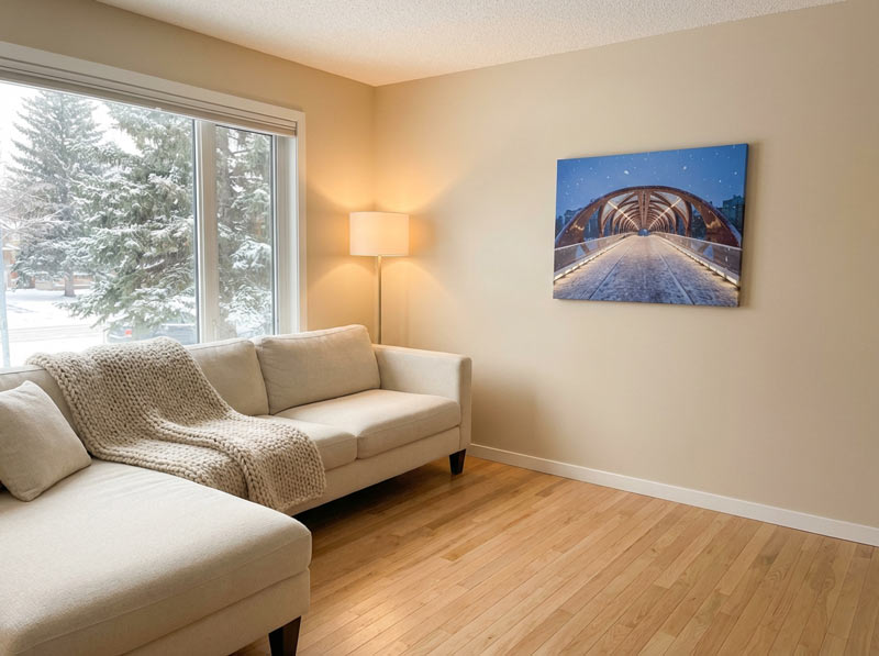 Not tiny prints that disappear on the wall. Not dark, muddy images that look fine on a phone and dull in real life. A properly made canvas print adds warmth, texture, and that “this place is lived-in” feeling—especially in Calgary’s long indoor season.