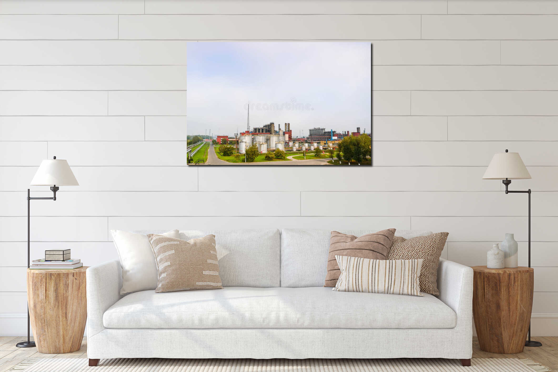 Industrial landscape, panoramic view of production. Chemical plants, columns, generators, pipes. Oil treatment systems. Canvas Print