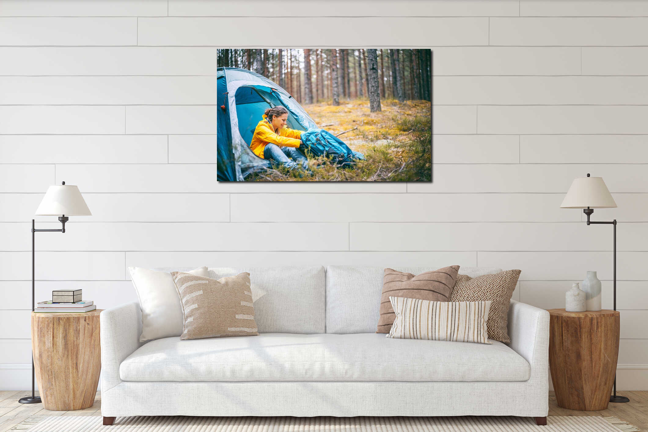 Young beautiful woman with a tent in the forest, camping, solo travel, nature concept Canvas Print
