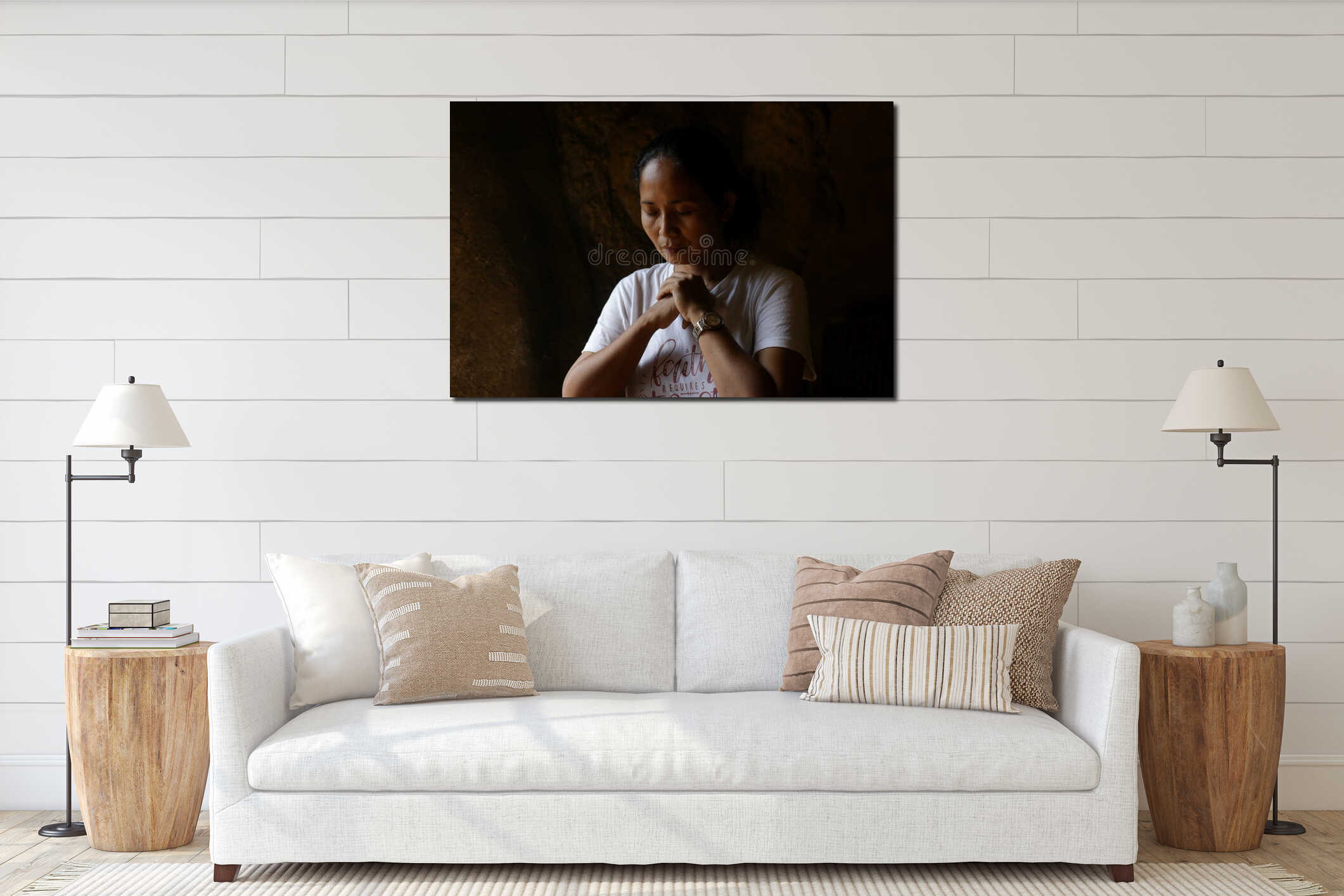 Portrait of young woman kneeling and praying in silent prayer pose, on abstract art background. Believe in God concept. Canvas Print