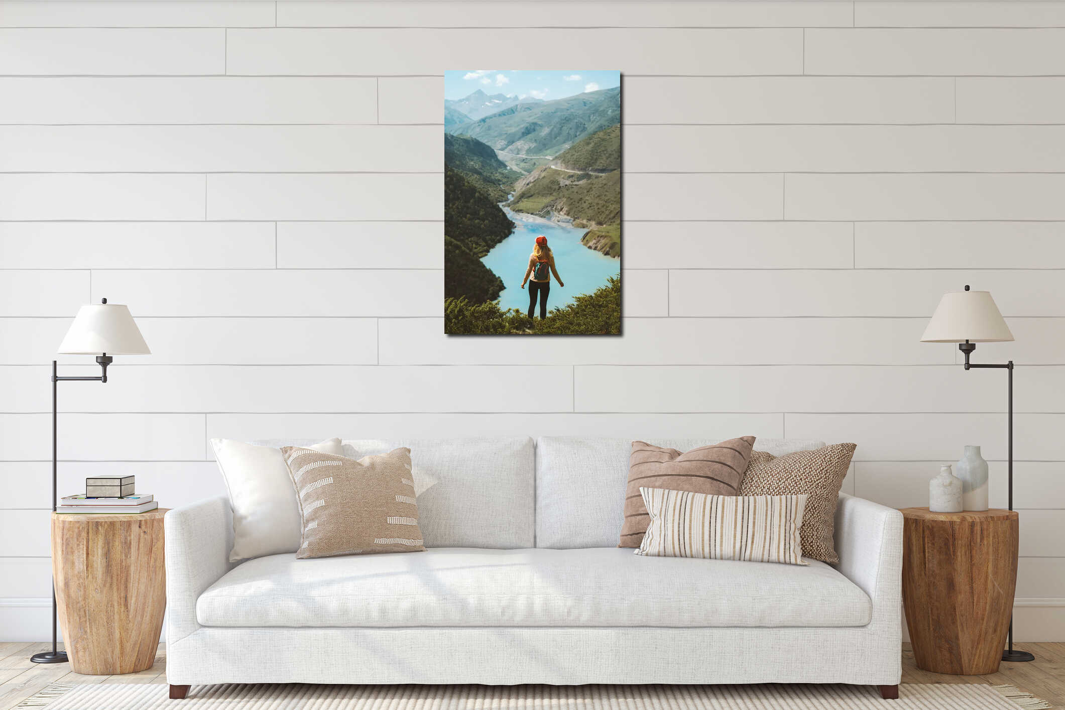 Traveler woman hiking solo enjoying lake aerial view travel adventure Canvas Print