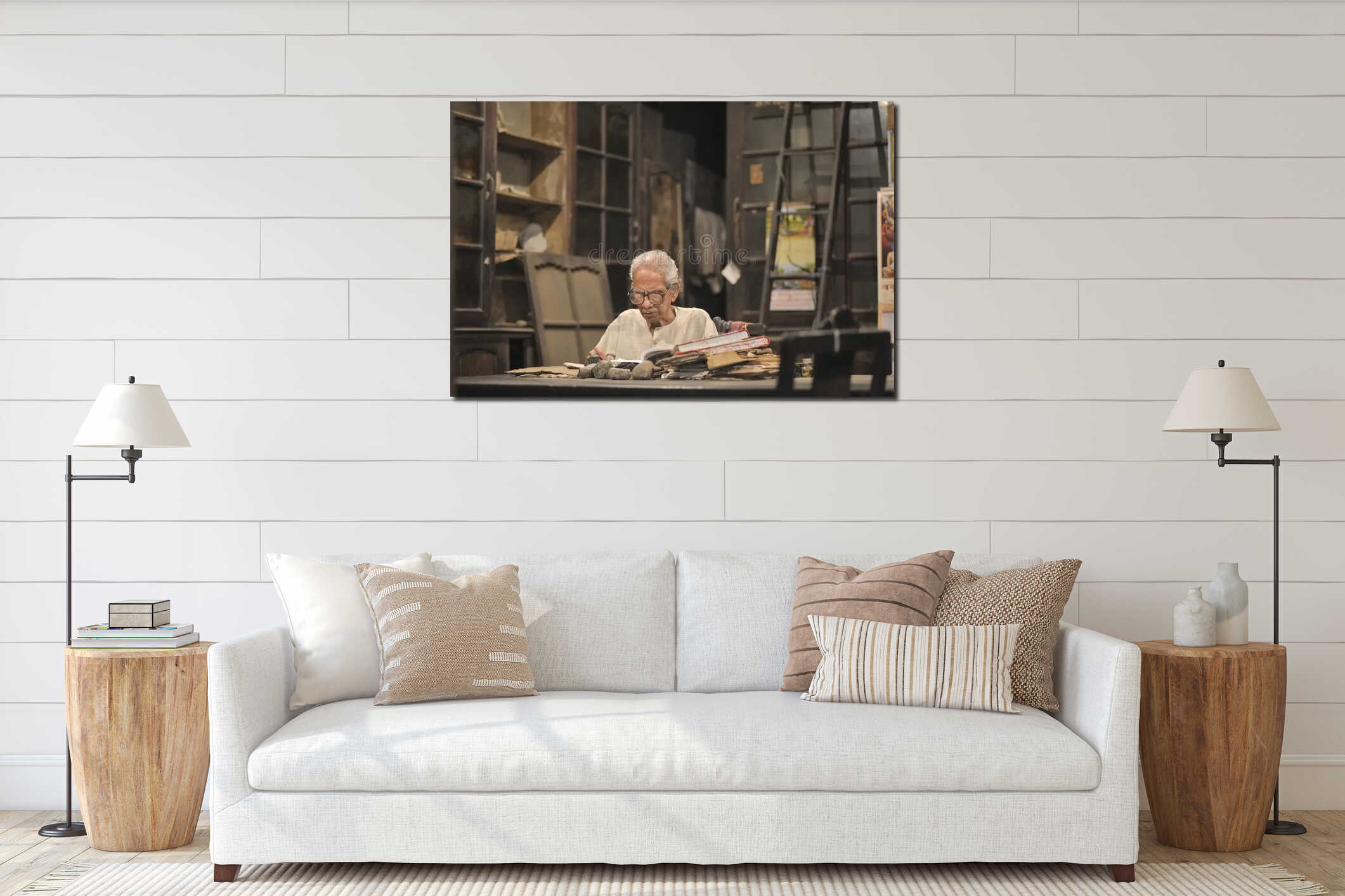 Elderly scholar reading ancient books in traditional library room in Varanasi India cultural heritage study Canvas Print