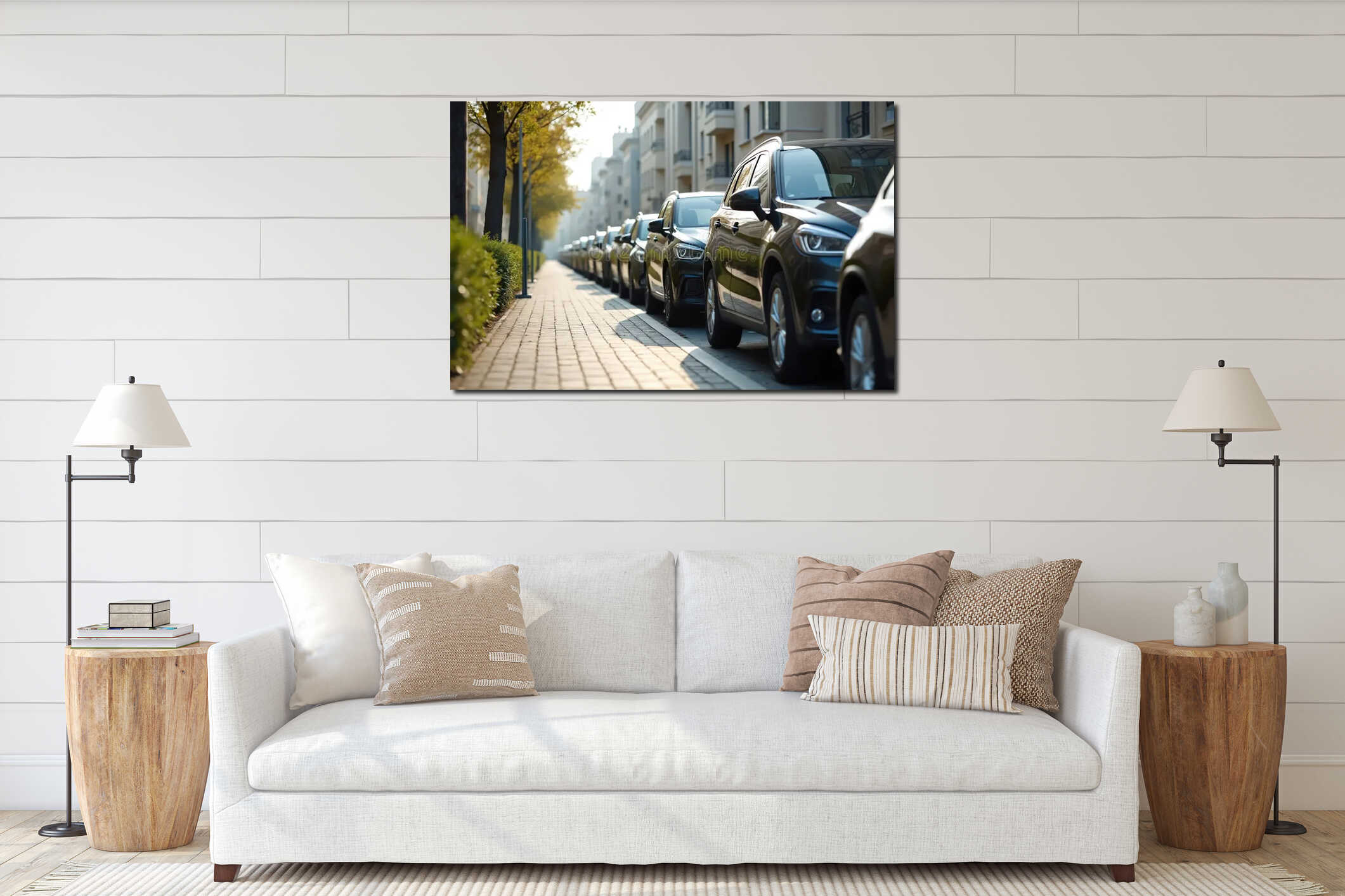 Long row modern cars parked tightly along city road. Urban transport infrastructure, parking problems, residential district. Canvas Print