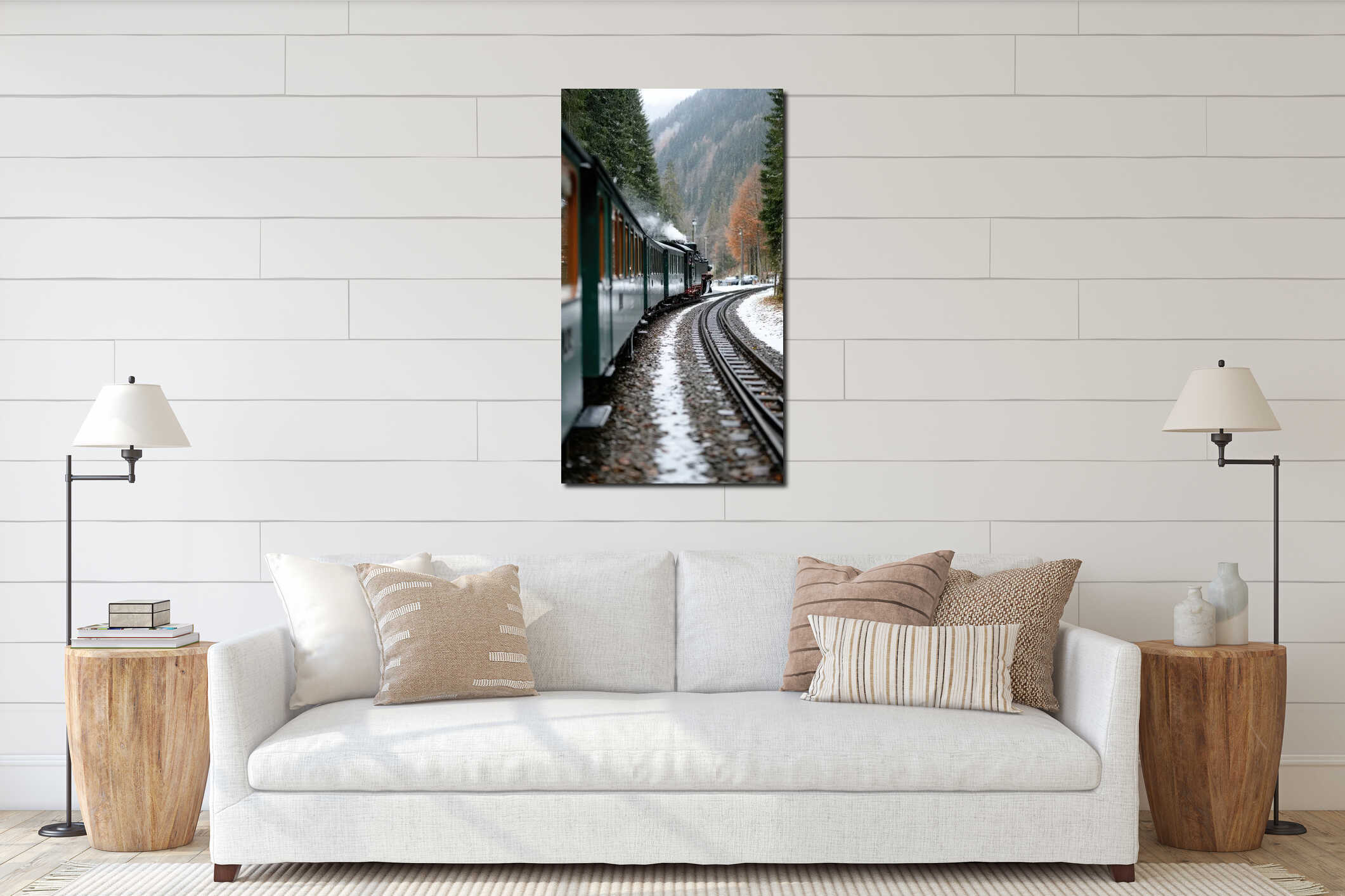 A vintage steam train journeys through snow-covered mountains and towering pines, capturing the spirit of winter adventure Canvas Print