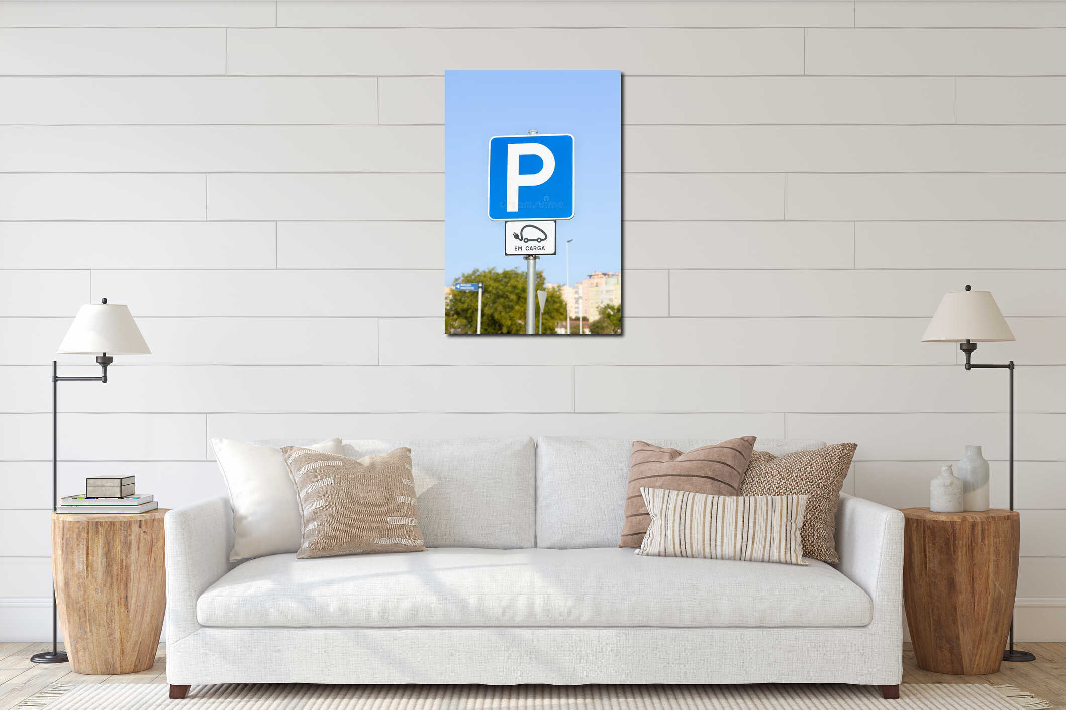 Parking sign in Lisbon, Portugal, indicating a dedicated space for electric vehicles Canvas Print
