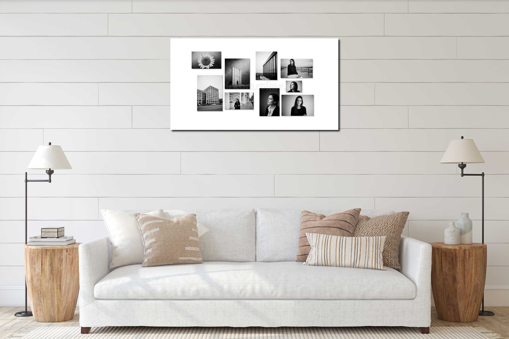 Collection of black and white portraits showcasing modern women in urban and artistic settings with floral element Canvas Print