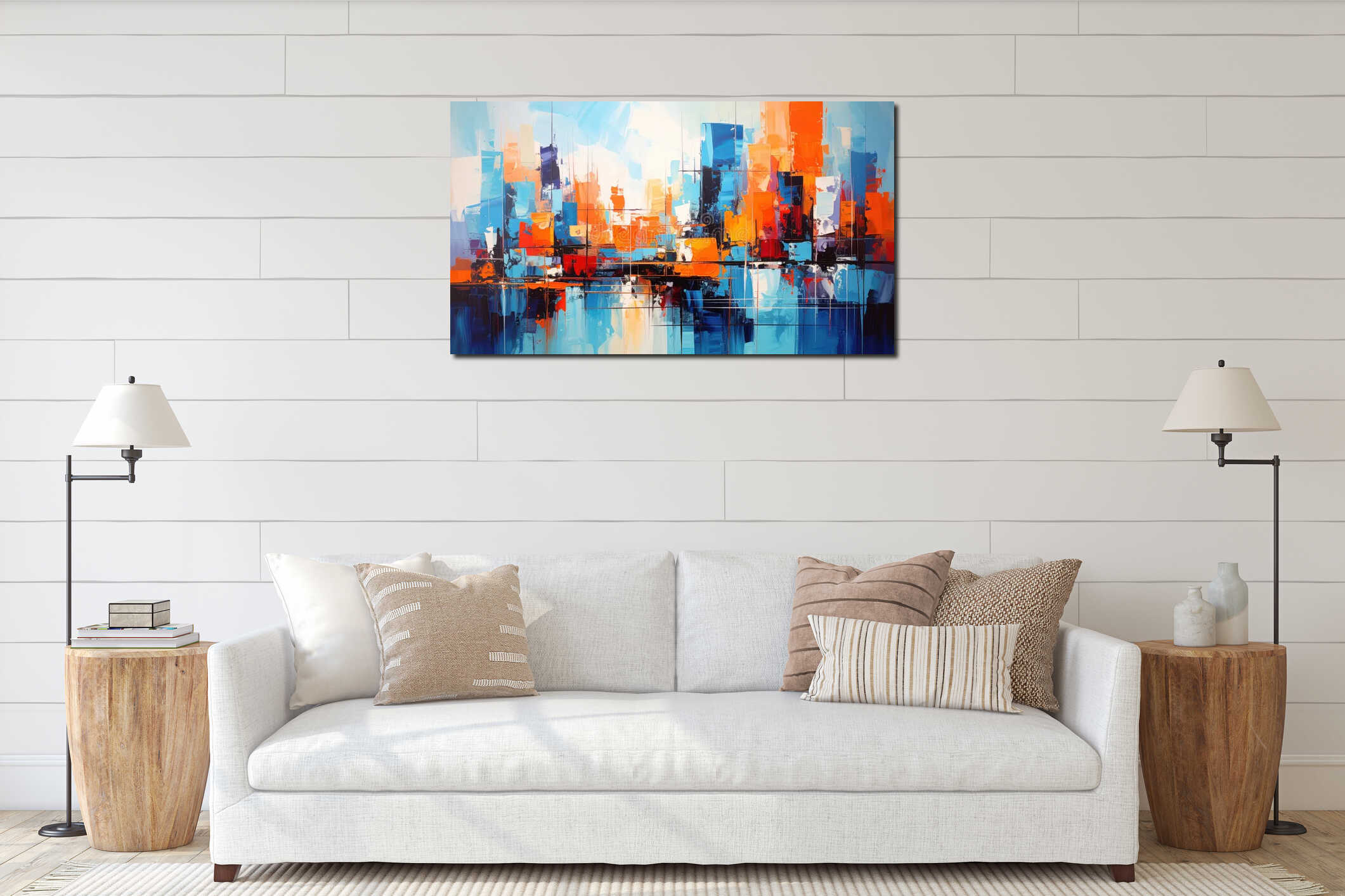 Abstract cityscape painting with bold strokes of orange and blue symbolizing urban energy, modern art composition inspired by Canvas Print
