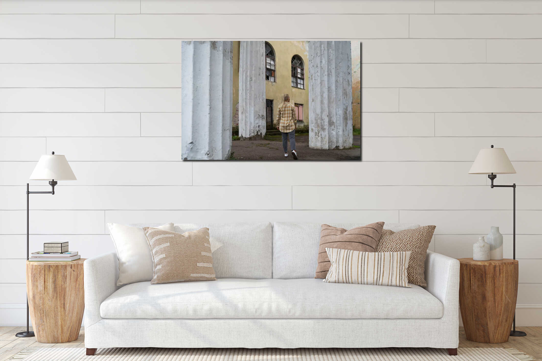 Urban exploration concept: A female tourist discovering a derelict historical mansion with decaying classical architecture and Canvas Print