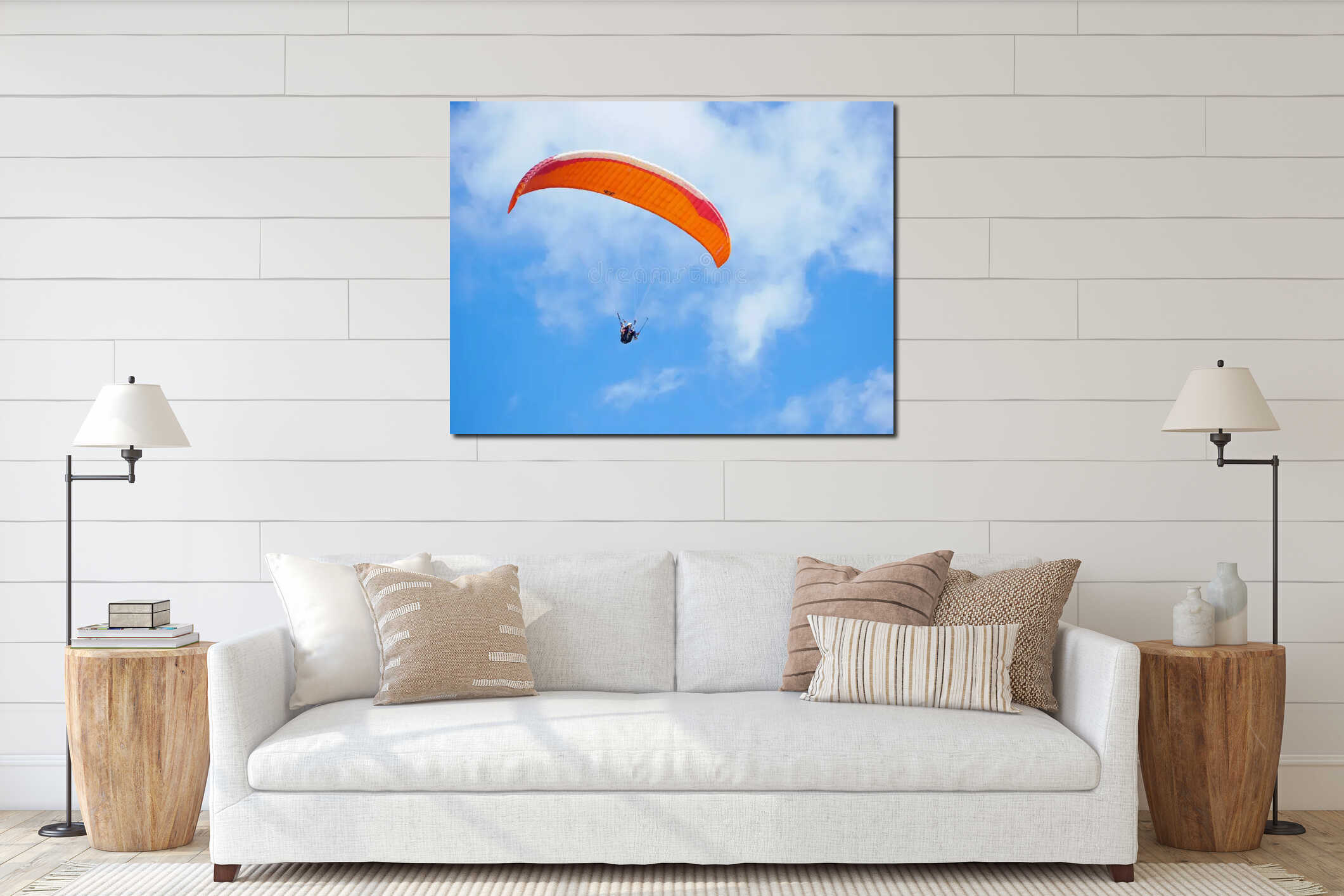 A person paragliding against a blue sky. The scene captures the thrill of adventure sports. Canvas Print