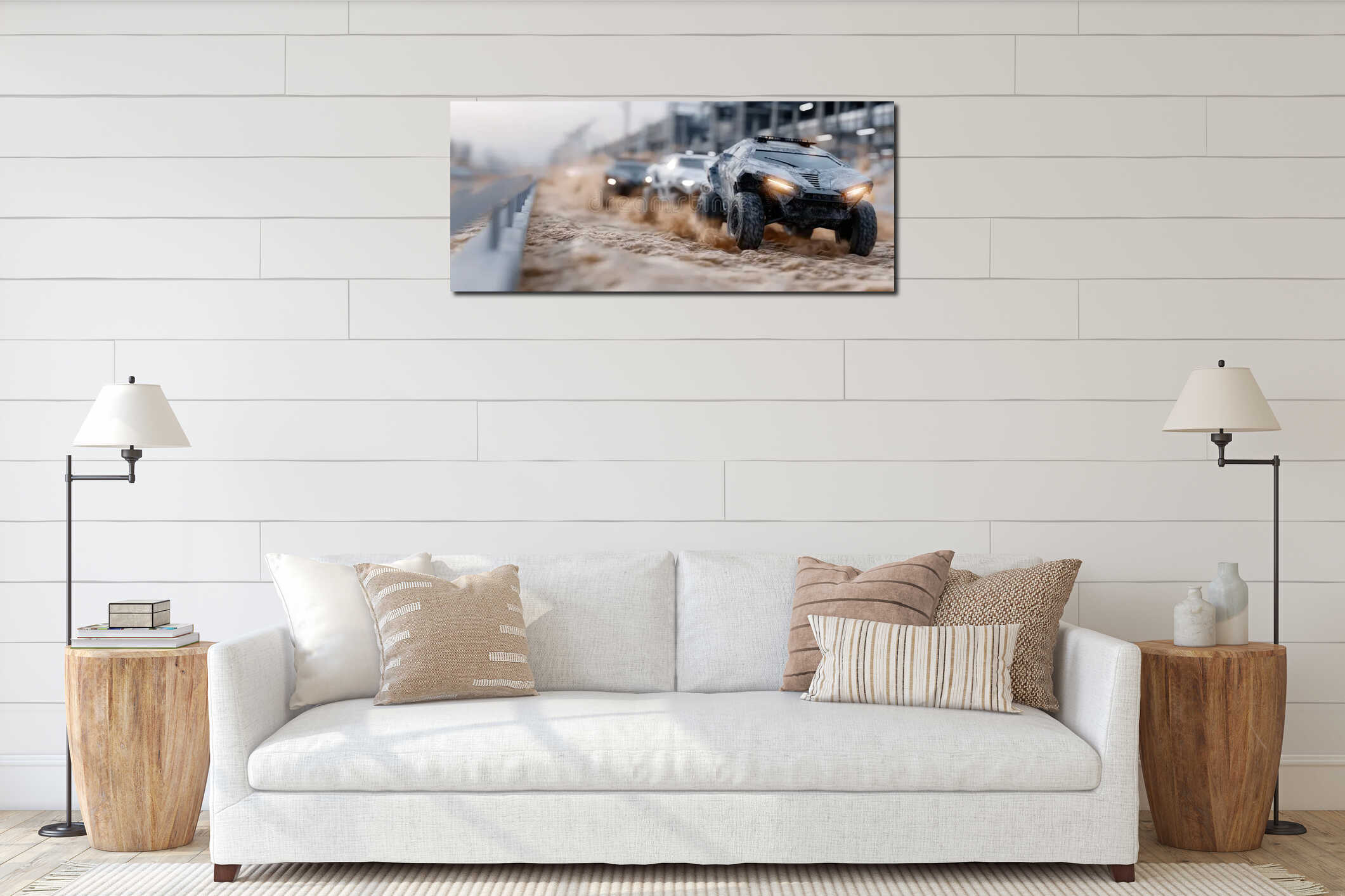 Three small off-road vehicles designed for rugged terrain glide across a dirt landscape while kicking up dust clouds in their wake Canvas Print