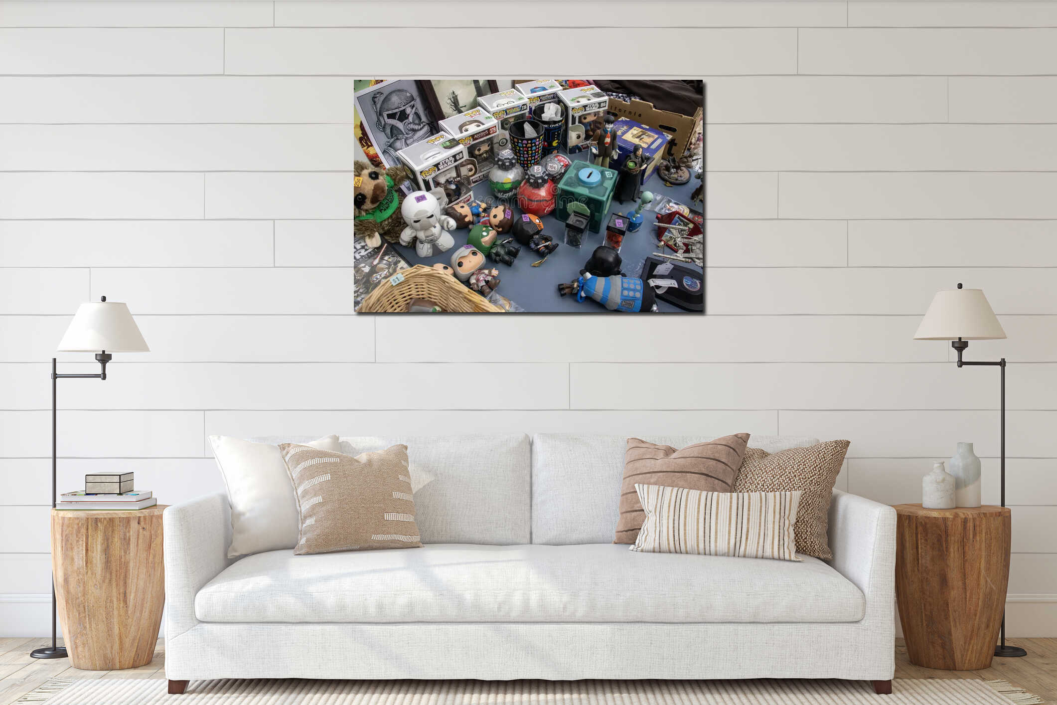 Scifi and fantasy toys and collectibles in a garage sale Canvas Print