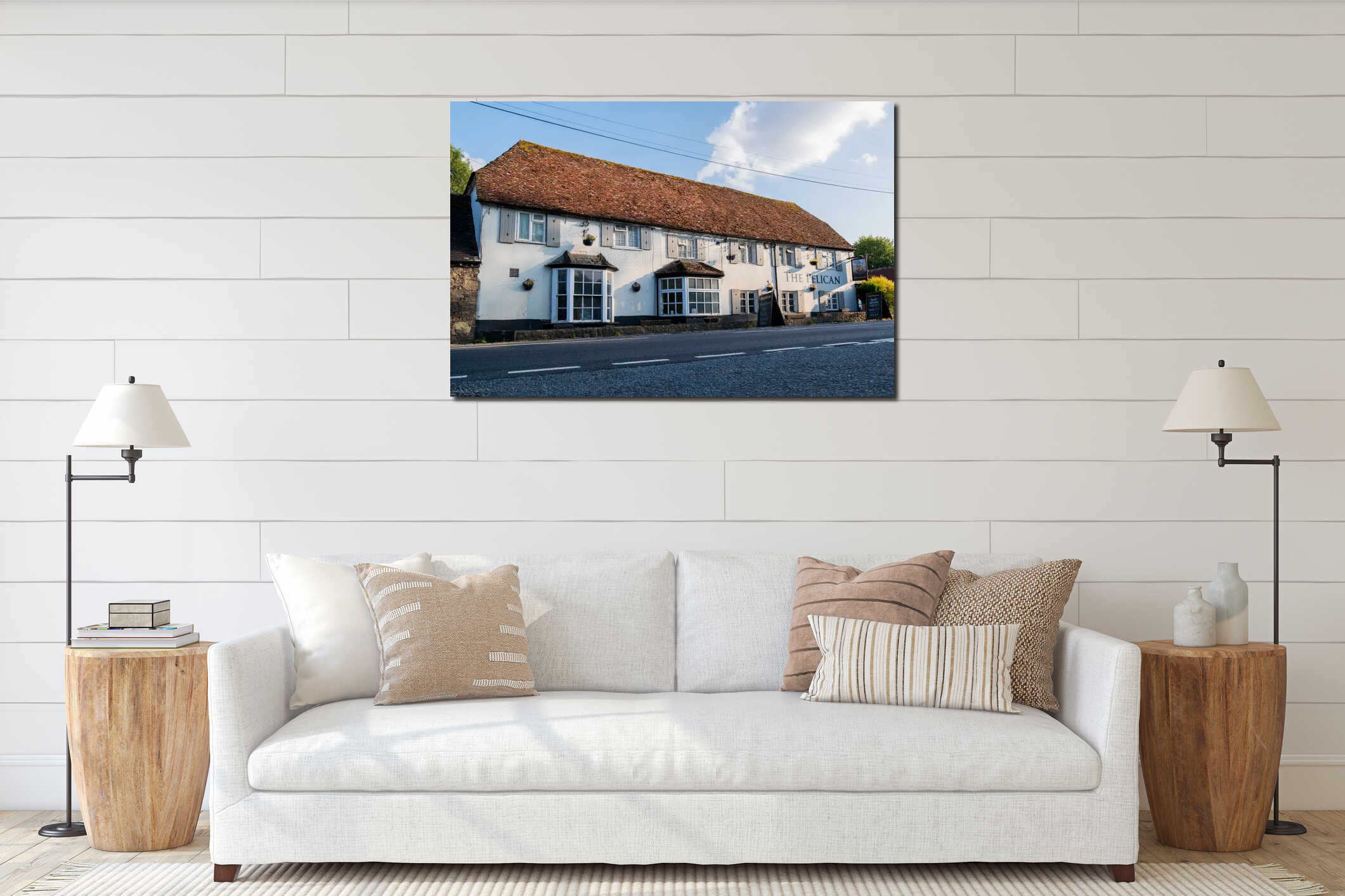 Salisbury UK: July 2025: The Pelican Inn in Salisbury features classic architecture with its traditional roof and rustic Canvas Print