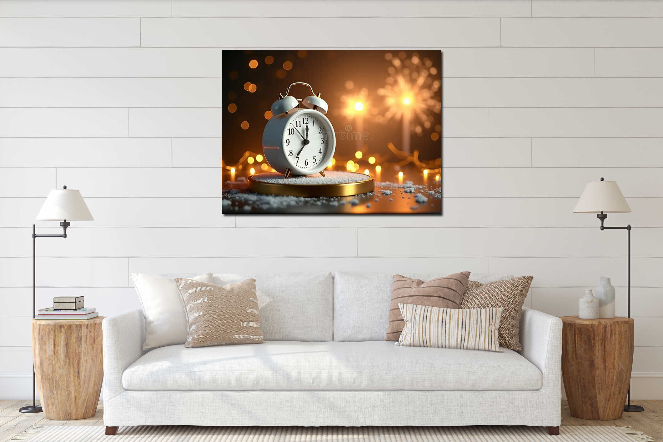 Classic Alarm Clock at Midnight on Golden Podium with Fireworks Bokeh for New Year Celebration Canvas Print