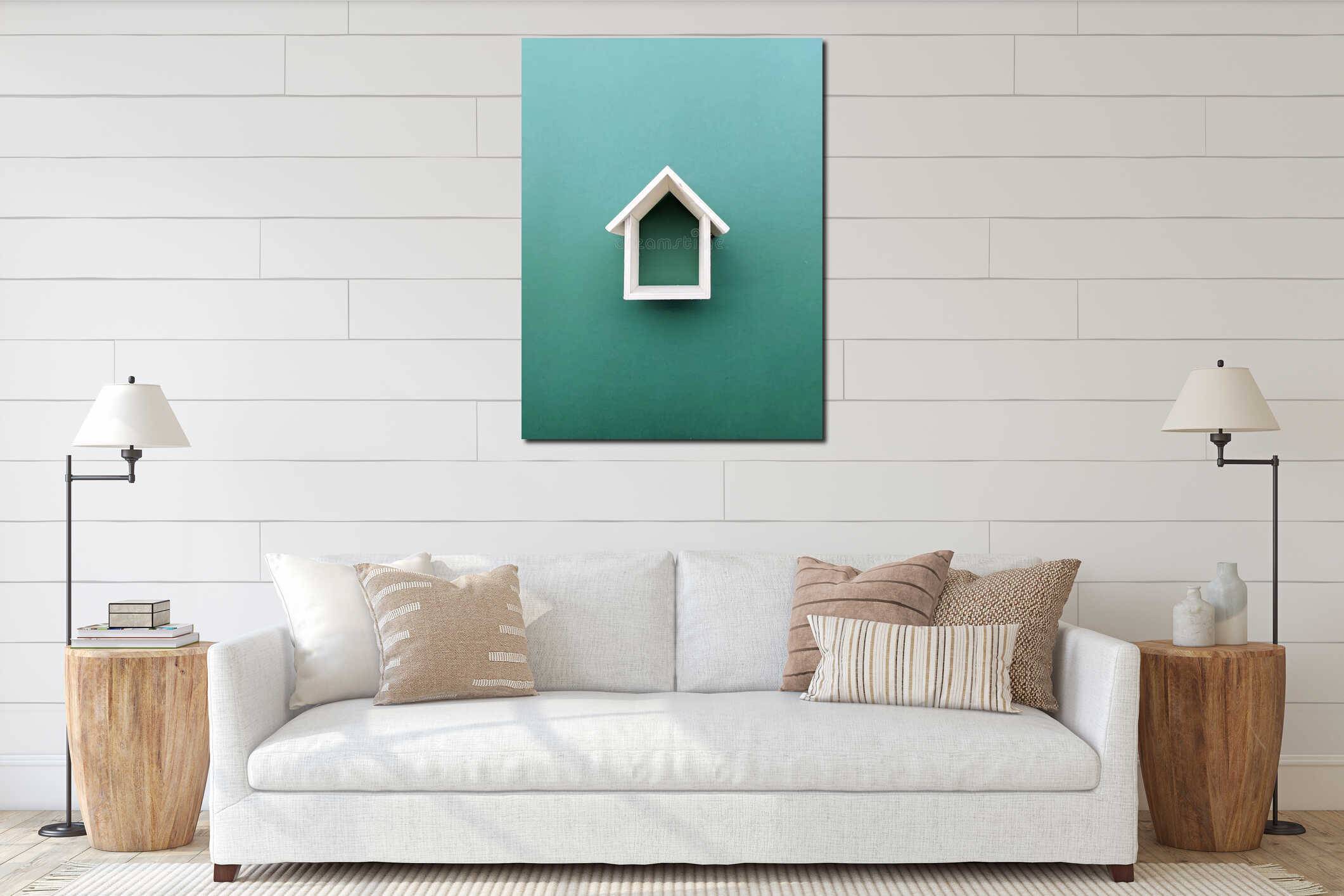 A small white wooden house frame sits on a green backdrop, showcasing clean lines and simplistic craft for architecture concept Canvas Print