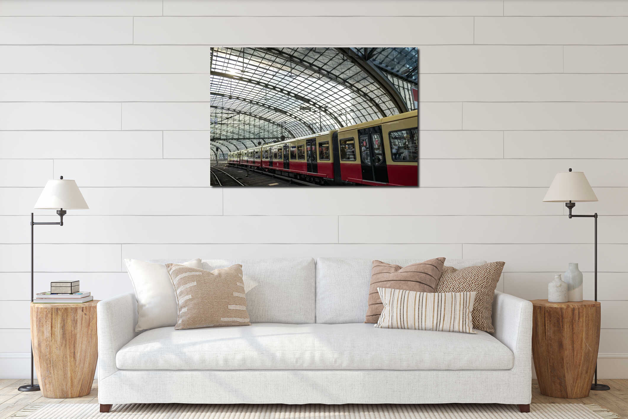 Train waiting at Berlin station. Modern glass roof architecture. Urban transportation hub. Reflection of passengers in windows Canvas Print