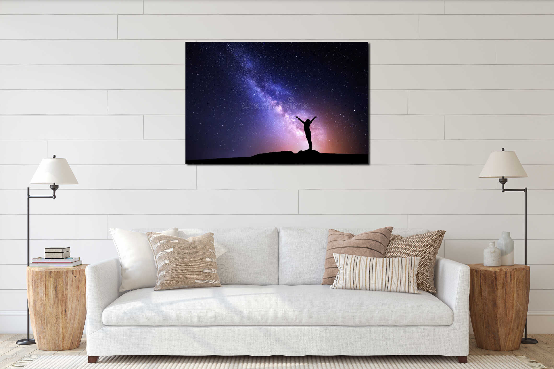 Milky Way. Night sky and silhouette of a standing girl Canvas Print